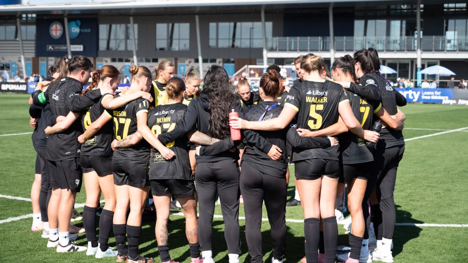 Main image: Wellington Phoenix players in a huddle after the 1-0 defeat to Melbourne City at ctrl:cyber Pitch in Melbourne. Photo: Jordan Martin/Jordan M Sport
